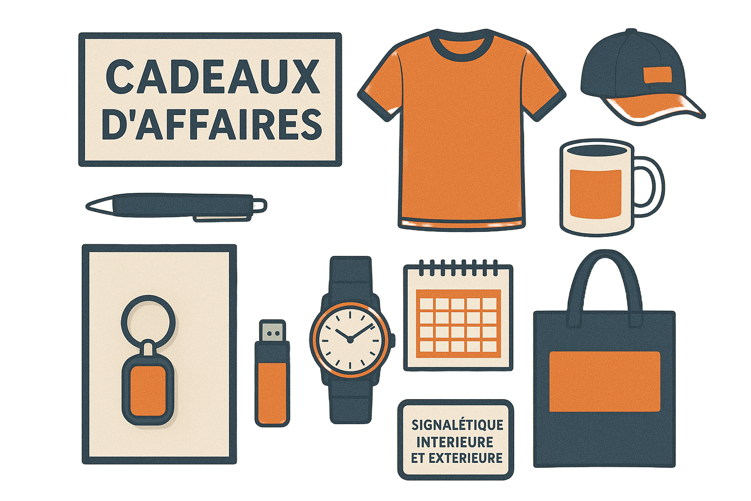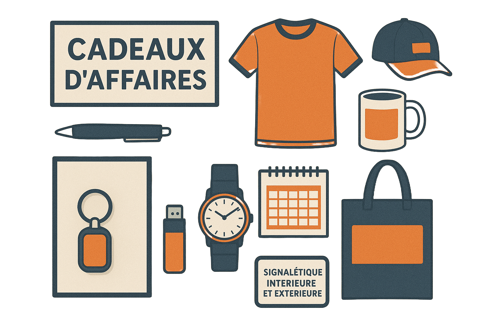 Cadeaux d'affaires, tee-shirt, casquettes, stylos, mugs, montres, etc.