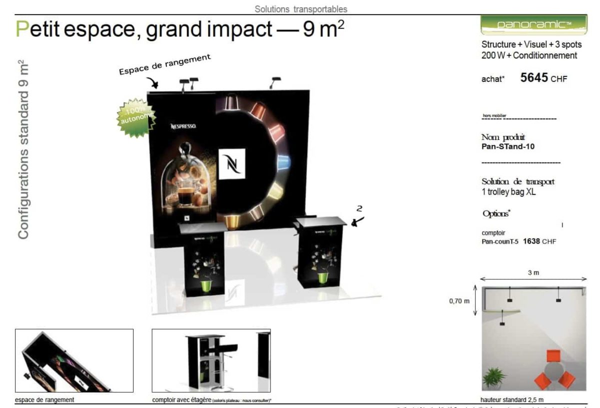 Comptoir pour promotions sur lieu de vente. Totalement pliable, composé de trois étagères en polystyrène blanc, d’un fronton blanc, de tubes et d’un bandeau blancs pour le visuel promotionnel. Formats des visuels: Supérieur: 780x330mm. Inférieur: 1750x880mm